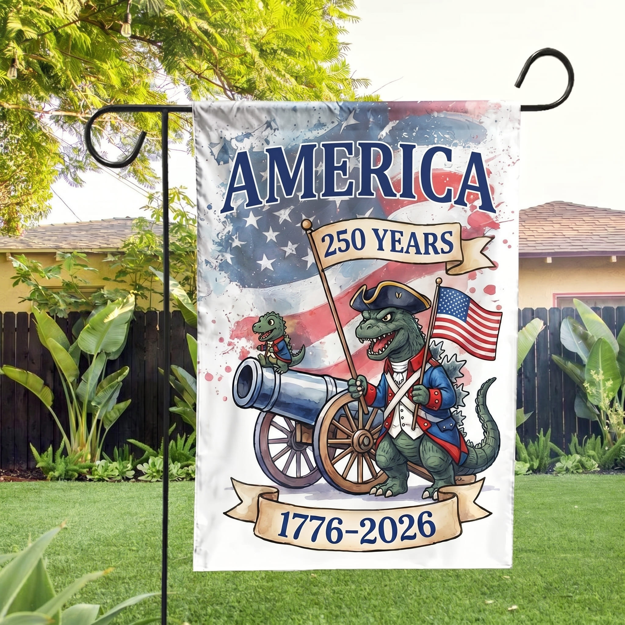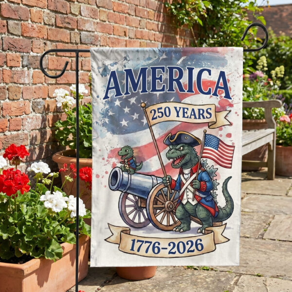Godzilla 250 Years of America Garden Flag! Perfect decoration for welcoming guests, holding family or friend gatherings. Printed on both sides to surround your garden and outdoor areas.
