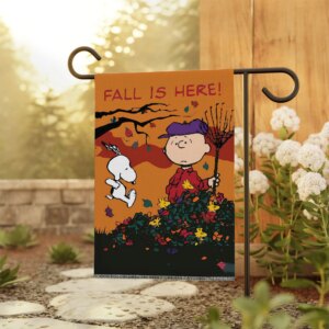 Welcome the autumn season with Snoopy! This charming garden flag features Snoopy enjoying the fall vibes, making it a perfect touch of warmth and whimsy for your yard or garden.