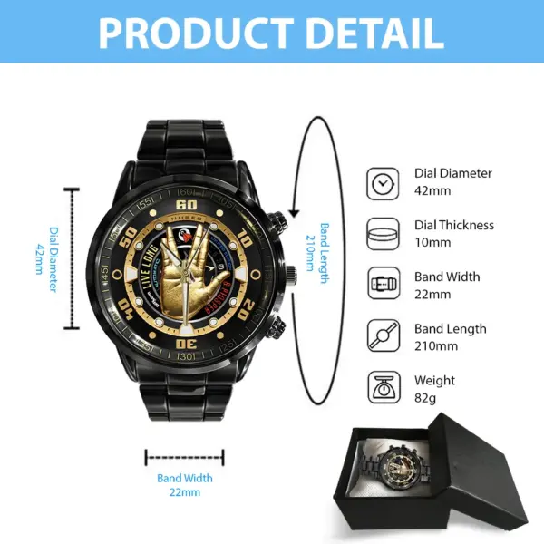 • Durable Construction: Crafted from high-quality stainless steel, this watch is built to withstand the test of time. The black coating not only adds a touch of luxury but also enhances its durability, making it resistant to scratches and wear.